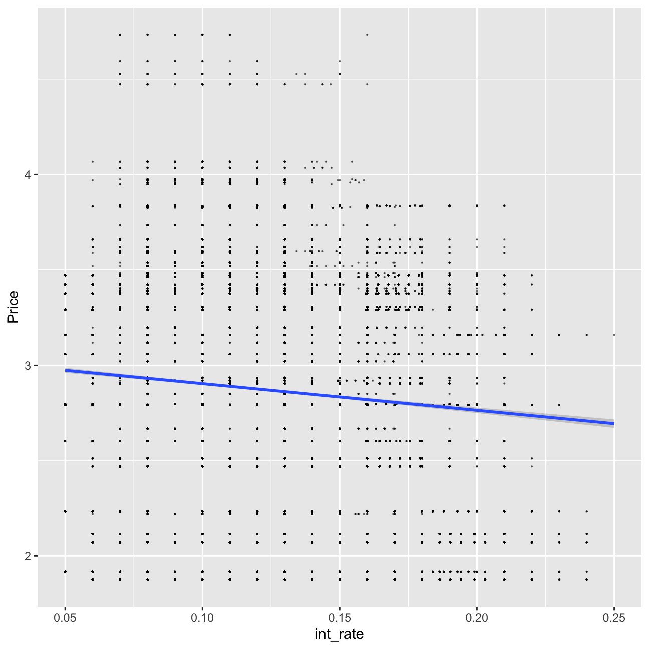 ggplot(aes(x=int_rate, y=Price))+geom_point(size=0.1, alpha=0.5)+geom_smooth(method="lm")
