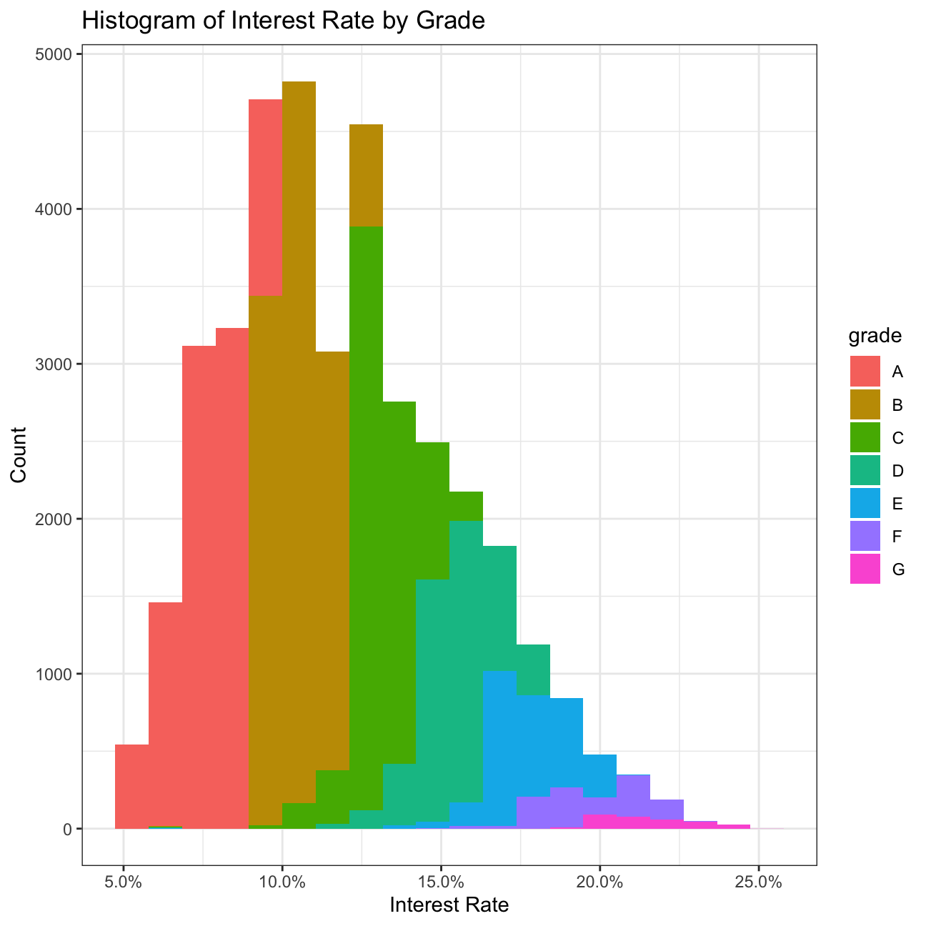 labs(title="Histogram of Interest Rate by Grade",
