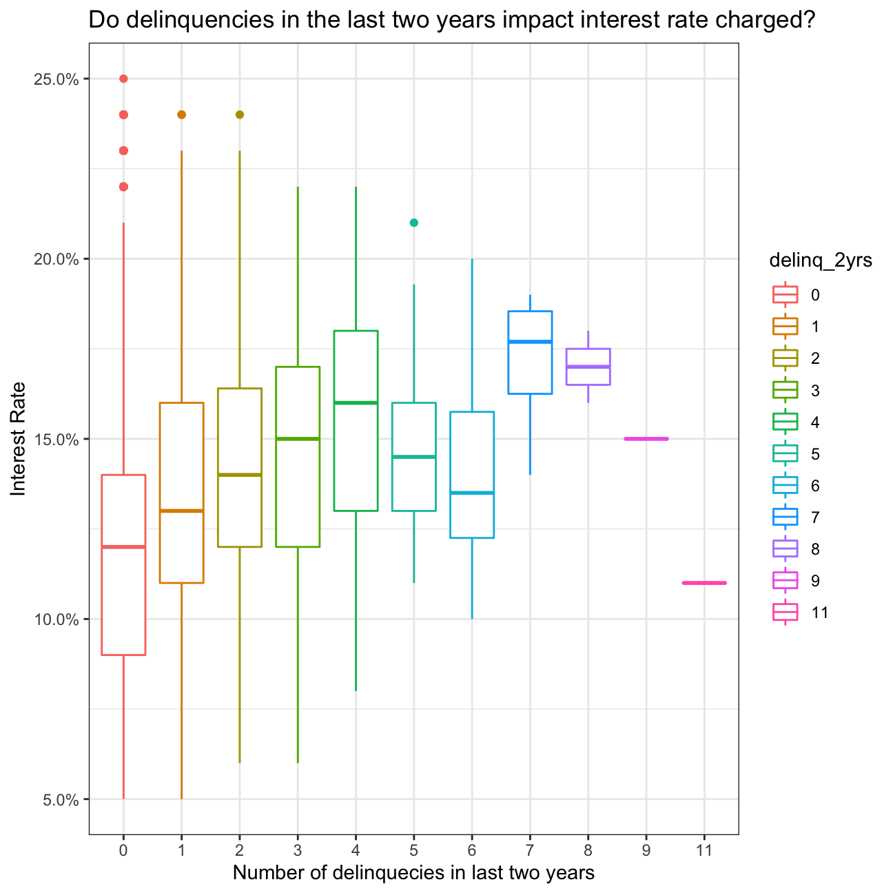 # box plots of the interest rate for every value of delinquencies