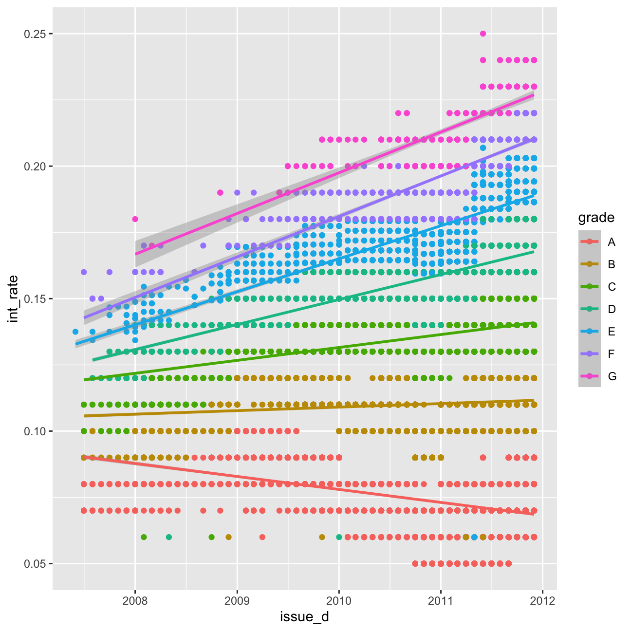 ggplot(aes(x=int_rate, y=Price, color=grade))+geom_point(size=0.1, alpha=0.5)+geom_smooth(method="lm")