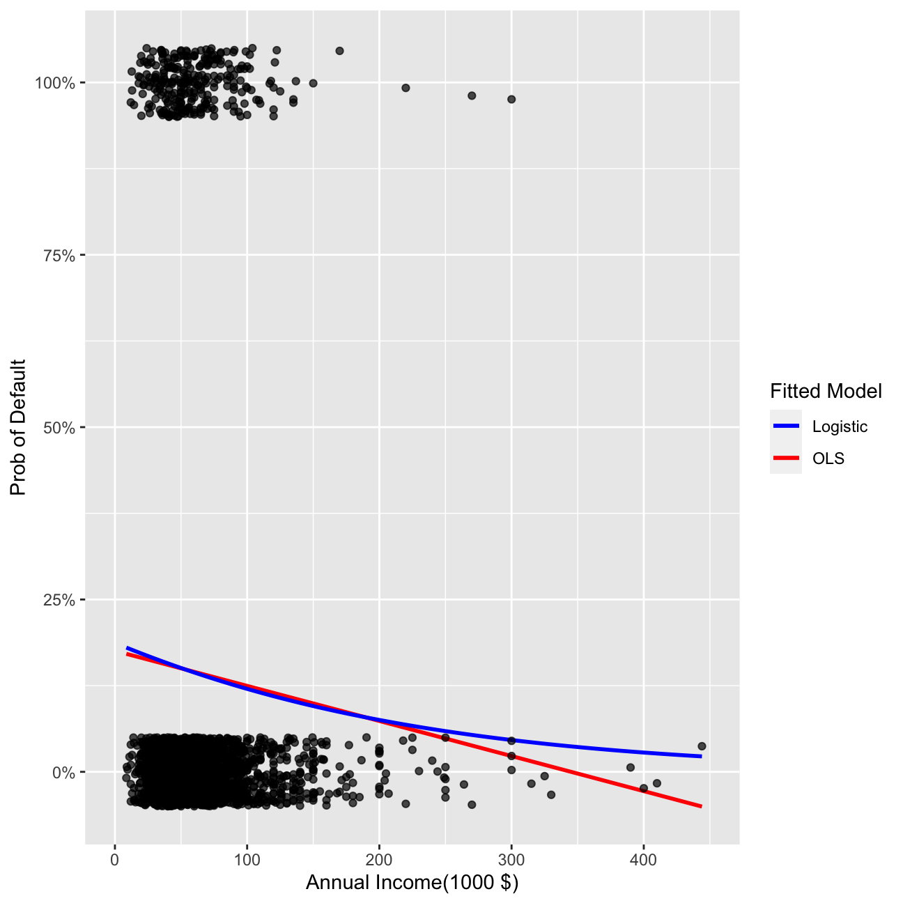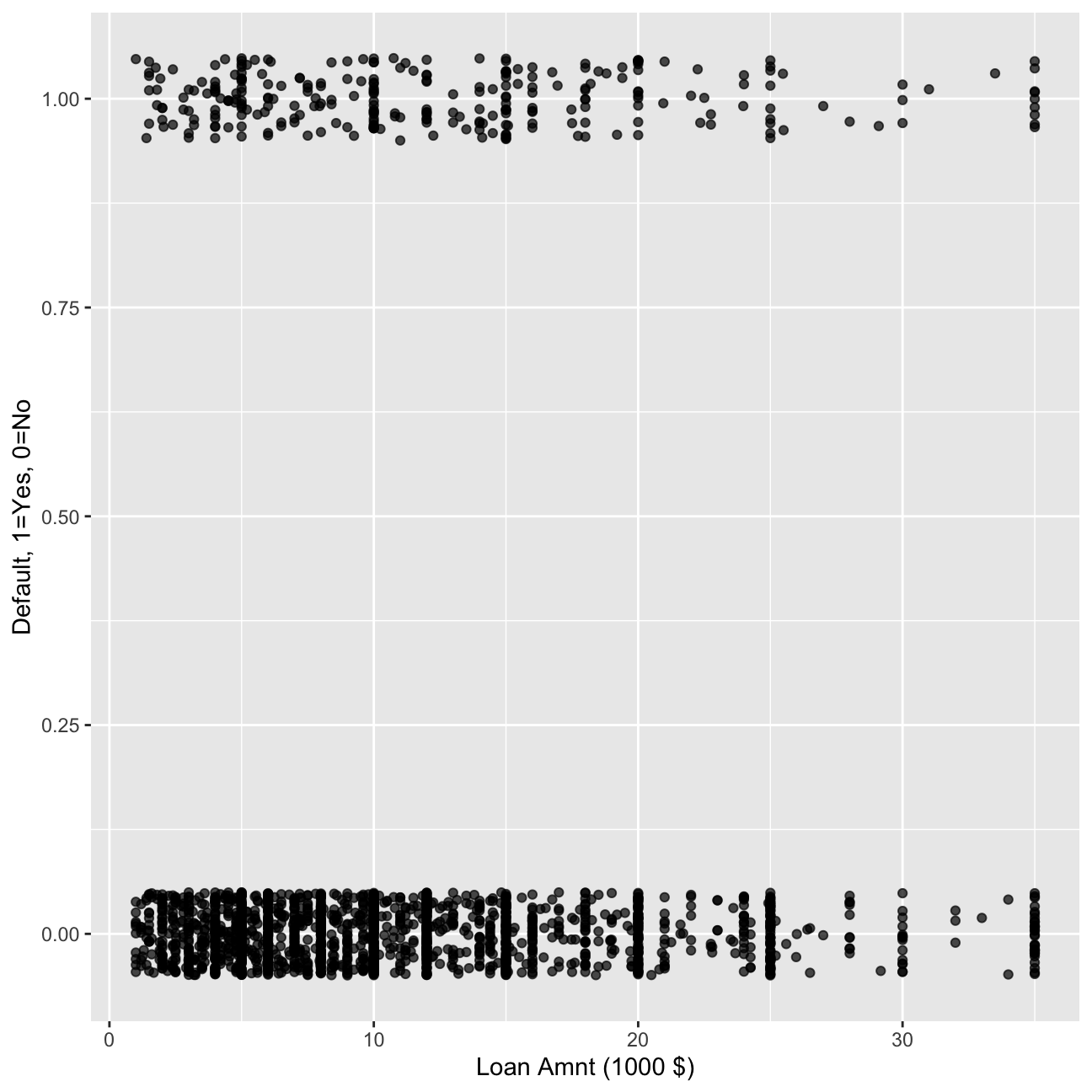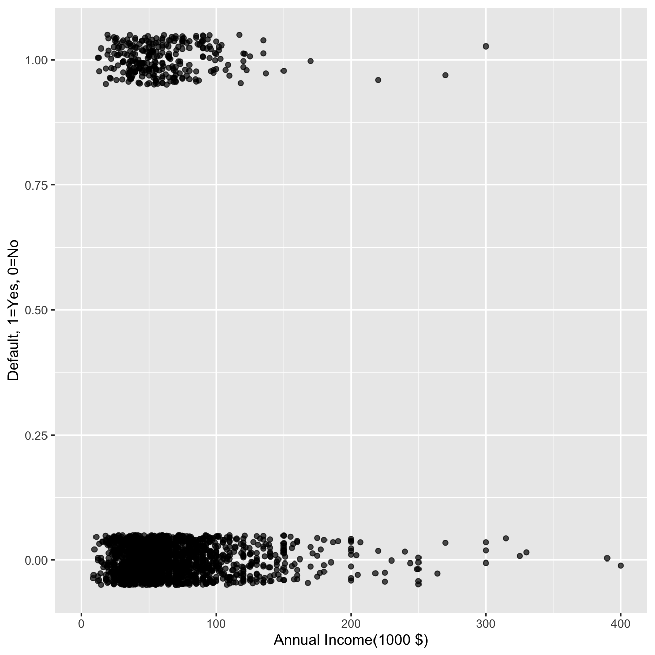 mutate(default=as.numeric(default)-1) # also convert default to a numeric {0,1} to make it easier to plot.