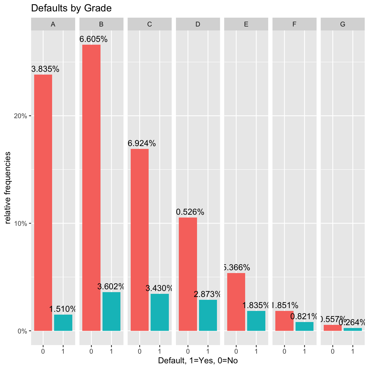 labs(title="Defaults by Grade", x="Default, 1=Yes, 0=No", y="relative frequencies") +