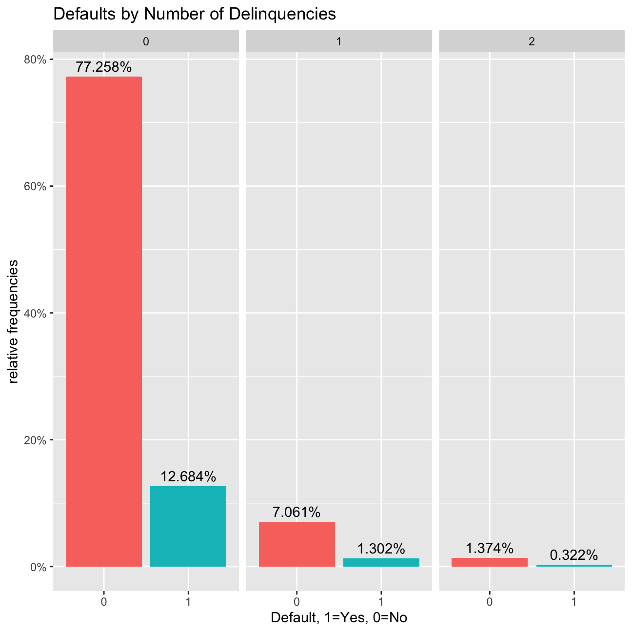 labs(title="Defaults by Number of Delinquencies", x="Default, 1=Yes, 0=No", y="relative frequencies") +