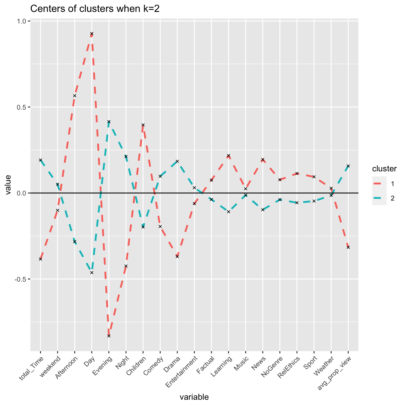 geom_line(aes(color = cluster,group = cluster), linetype = "dashed",size=1) + geom_point(size=2,shape=4)+geom_hline(yintercept=0) +