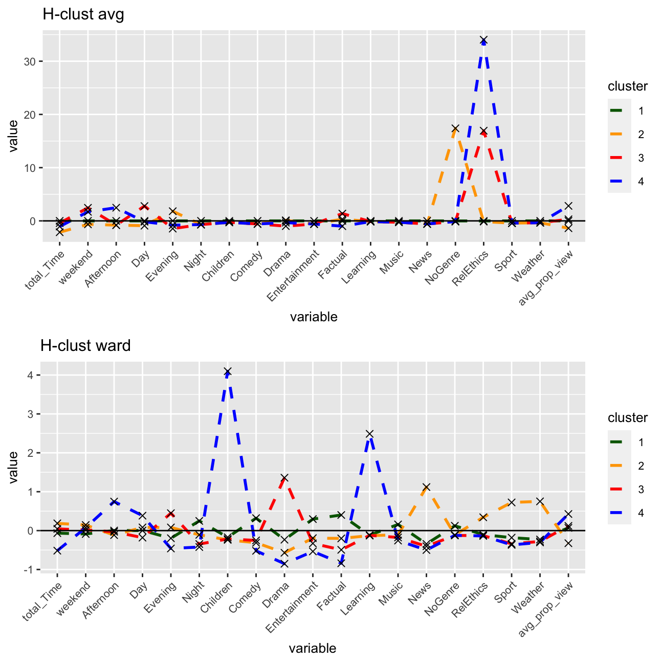 I can also identify roughly the attributes of the other three clusters: cluster one being the drama group (watching more drama in the evenings), cluster two being the functional group (watch more sports and news during the day, don’t often finish shows they watch), and cluster three being the entertainment group (watch more informational intensive shows and don’t have a clear time pattern).