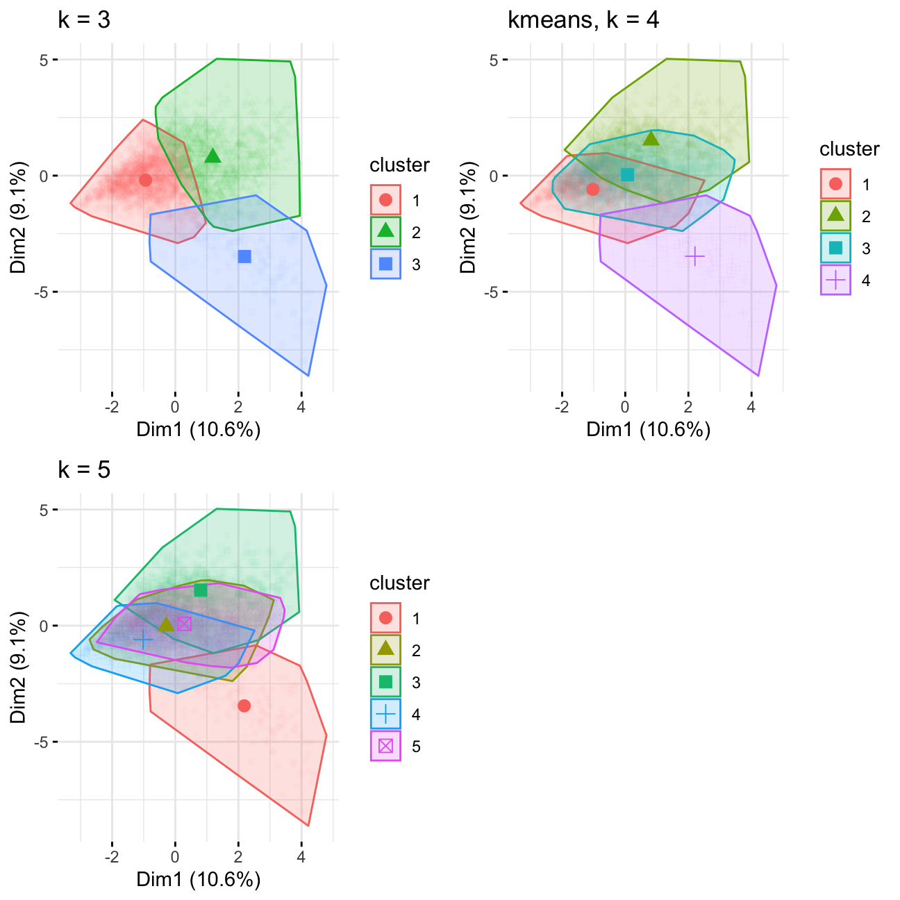 grid.arrange(graphkmeans_3Pam,graphkmeans_4Pam,graphkmeans_5Pam, nrow = 2)