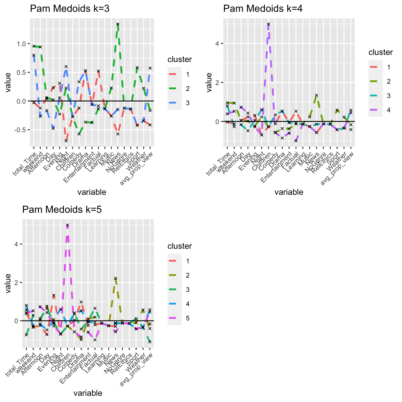 graphkmeans_5Pam<-ggplot(cluster_medoids_t, aes(x = variable, y = value))+ geom_line(aes(color =cluster,group = cluster), linetype = "dashed",size=1)+ geom_point(size=1,shape=4)+geom_hline(yintercept=0)+theme(text = element_text(size=10),