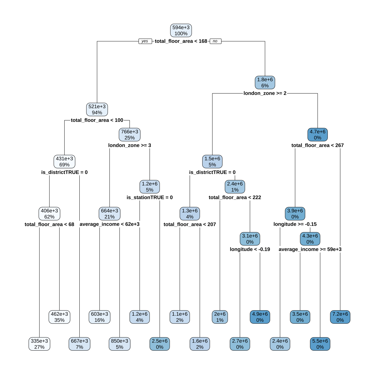 As we can see, the Rsuqared achieves the best results in comparison to our all previous models. the RMSE is equal to 189661.2 and the Rsquare equals 86.8%. Therefore, we will use this model as an estimation engine to guide the investment on the housing market in London.