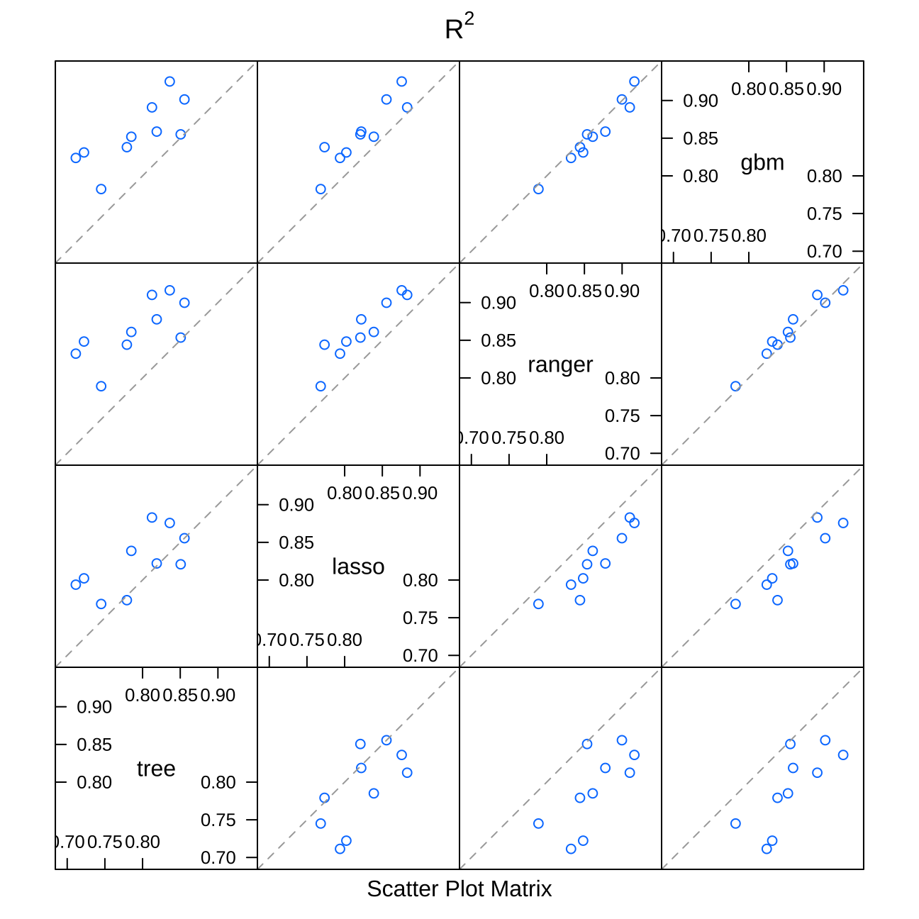 splom(resamples(multimodel), metric="Rsquared") #all the models' performance interactions