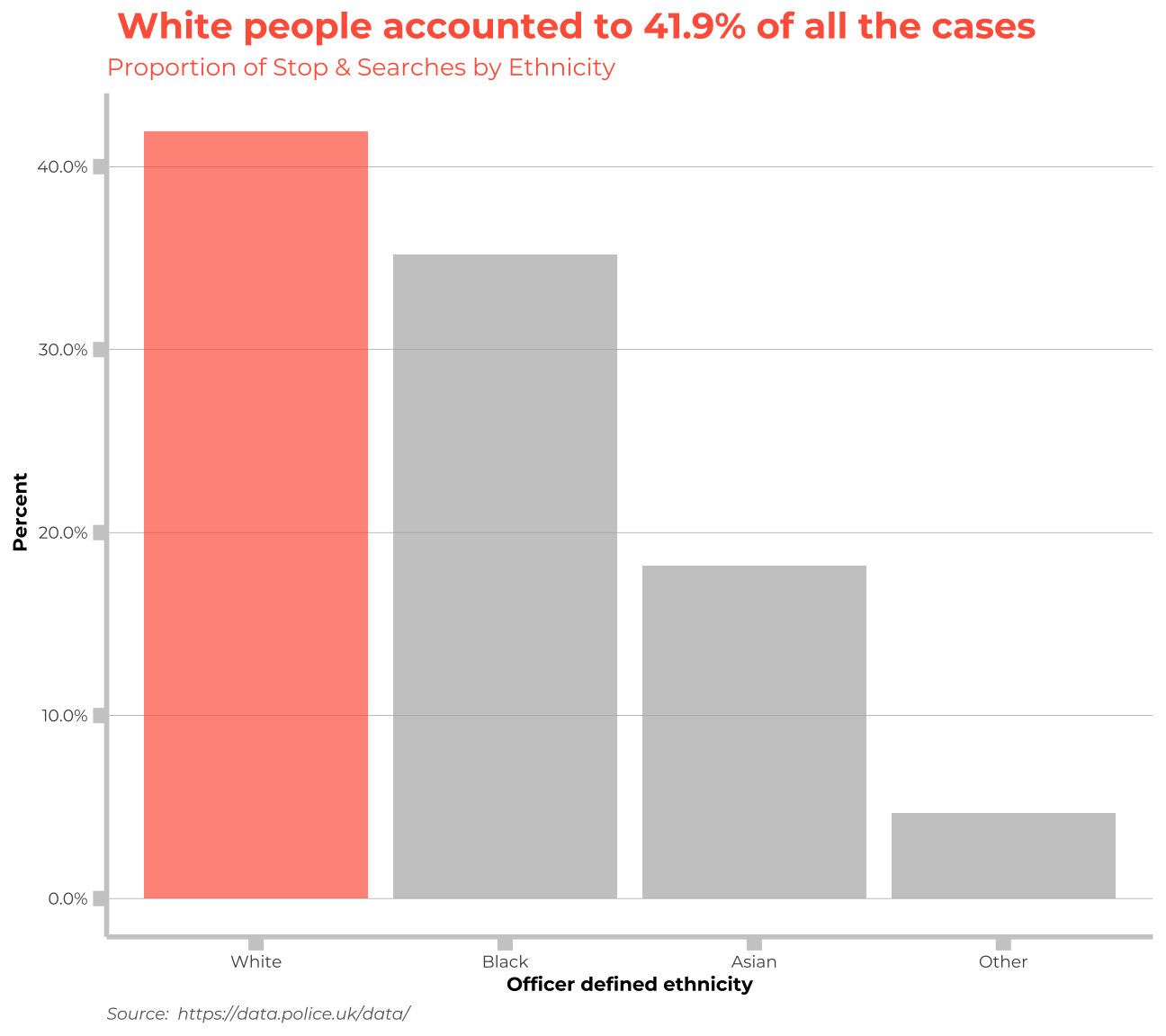 labs(title = " White people accounted to 41.9% of all the cases", subtitle= "Proportion of Stop & Searches by Ethnicity ", x="Officer defined ethnicity", y=" Percent", caption="Source: https://data.police.uk/data/") +
