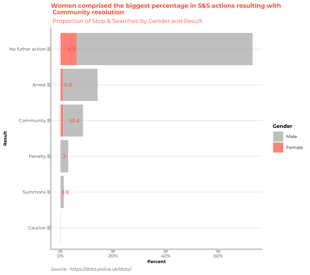 labs(title = "Women comprised the biggest percentage in S&S actions resulting with\n Community resolution", subtitle= " Proportion of Stop & Searches by Gender and Result", x="Percent", y="Result",fill= "Gender",caption="Source: https://data.police.uk/data/") +