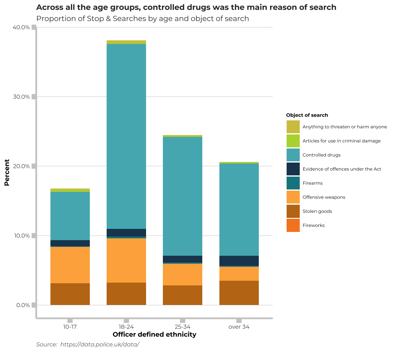 labs(title = "Across all the age groups, controlled drugs was the main reason of search", subtitle= "Proportion of Stop & Searches by age and object of search", x="Officer defined ethnicity", y="Percent",fill= "Object of search",caption="Source: https://data.police.uk/data/") +
