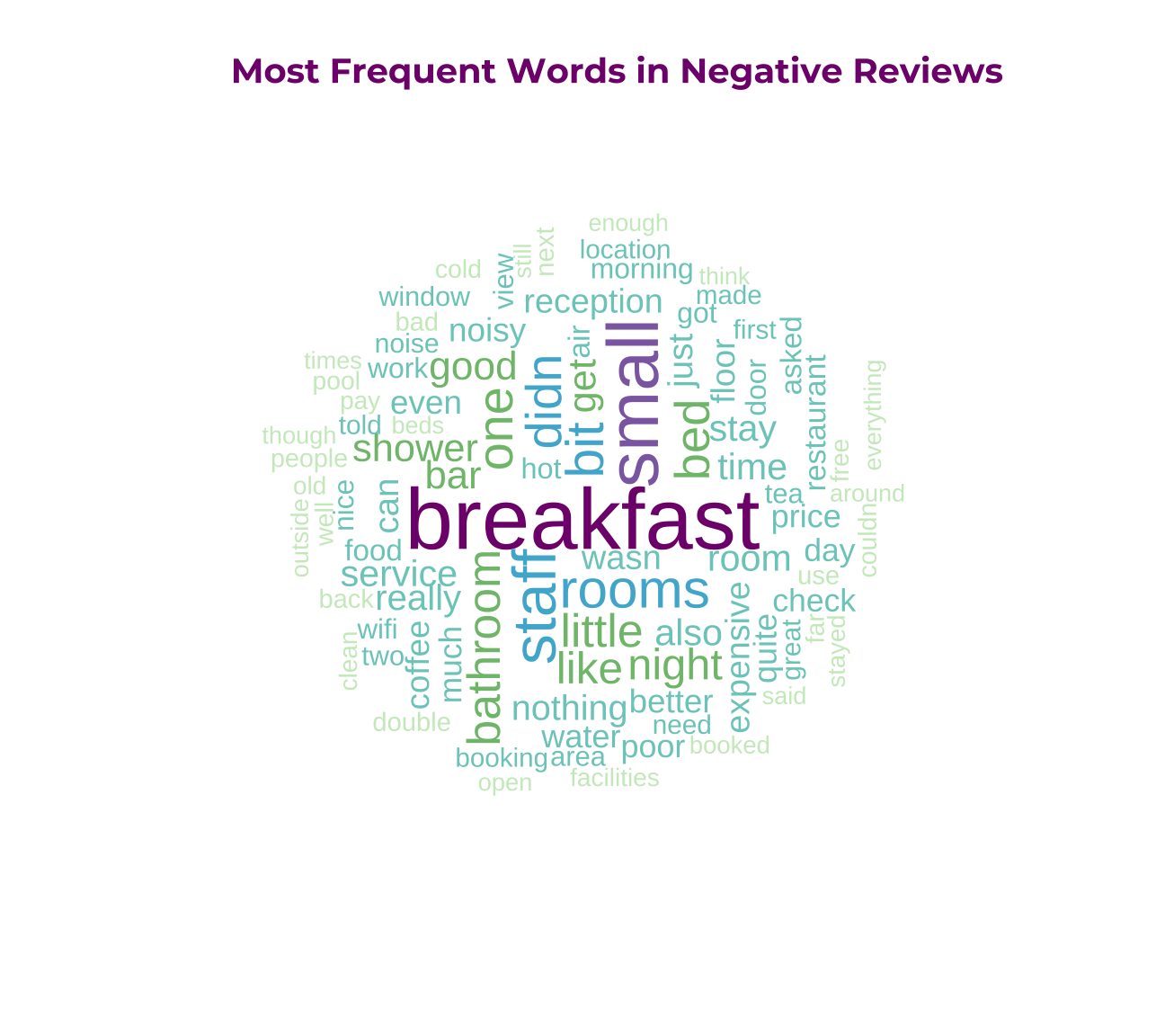 title(main = "Most Frequent Words in Negative Reviews", col.main = "#810f7c", size = 8, family="Montserrat", face = "bold")